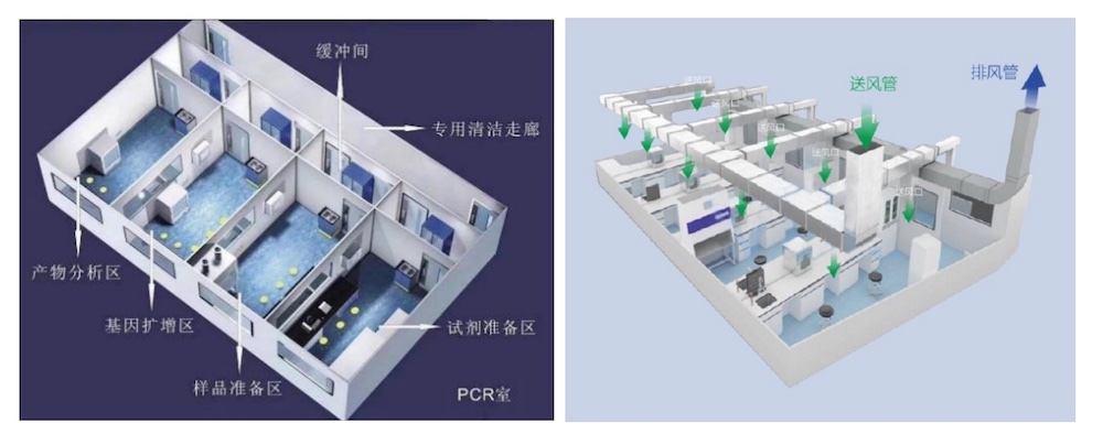 A PCR laboratory is typically divided into four areas: reagent preparation area, specimen preparation area, gene amplification area, and product analysis area. Each area has a dedicated buffer area and a separate clean corridor. PCR laboratories have strict requirements for air conditioning and ventilation systems.