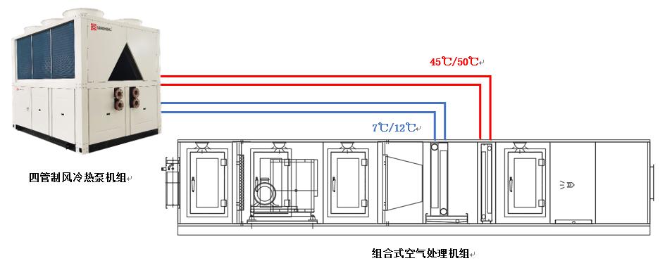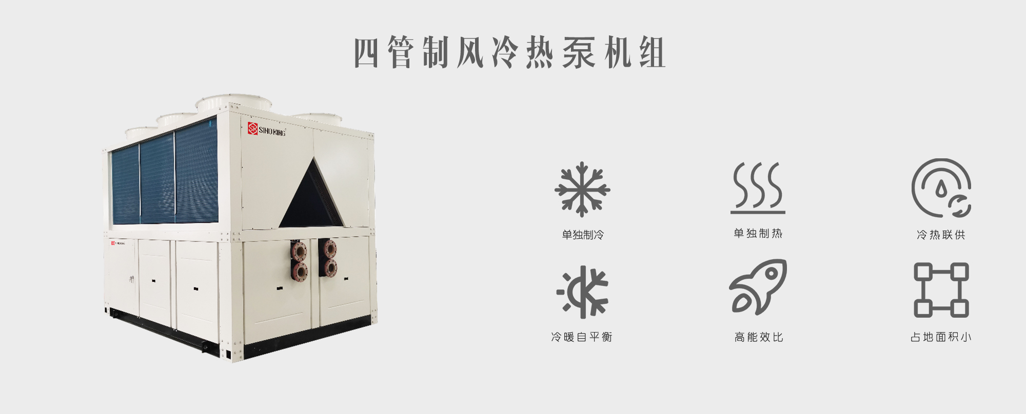 SINO KING recommends using four-pipe air-cooled heat pump units for the cold/heat source, which can operate in cooling-only, heating-only, or cooling and heating mode. While obtaining chilled water from the evaporator, the units can simultaneously obtain hot water through condensation heat from the heat exchanger, with any imbalance discharged through auxiliary heat exchangers. This meets the real-time precise control for both cooling and heating loads, and achieves cooling and heating at the same time with only one energy input. The comprehensive energy efficiency TCOP reaches up to around 8.0, significantly reducing the energy consumption.